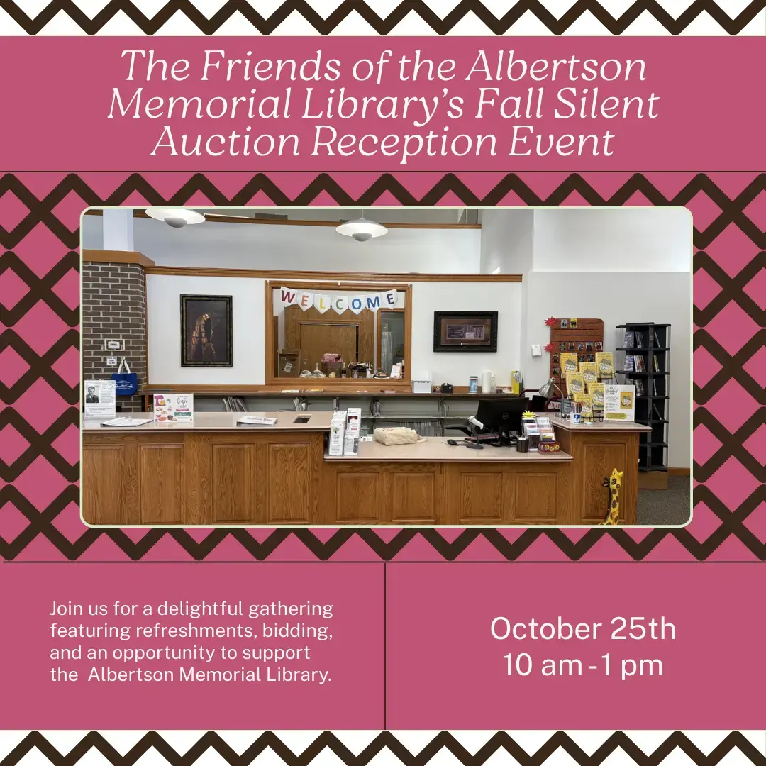 The Friends of the Albertson Memorial Library invite you to a reception on the final day of their annual fall silent auction fundraiser. Join us on October 25th from 10 a.m. to 1 p.m. Refreshments will be