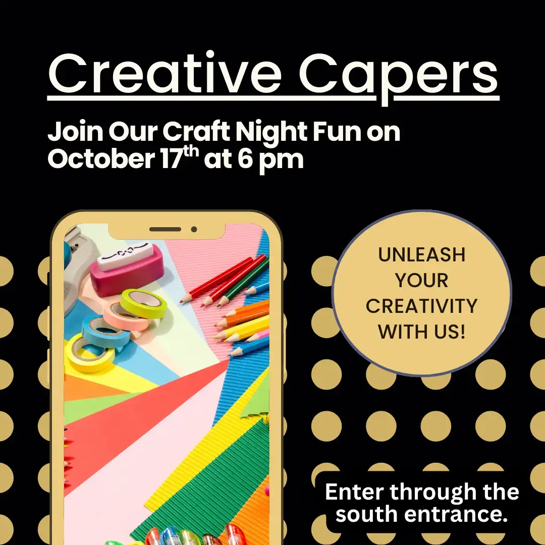 Join the Creative Capers’ craft night fun on October 17th at 6 pm! Unleash your creativity by bringing the craft of your choice for an evening of socializing, snacking, and creation!