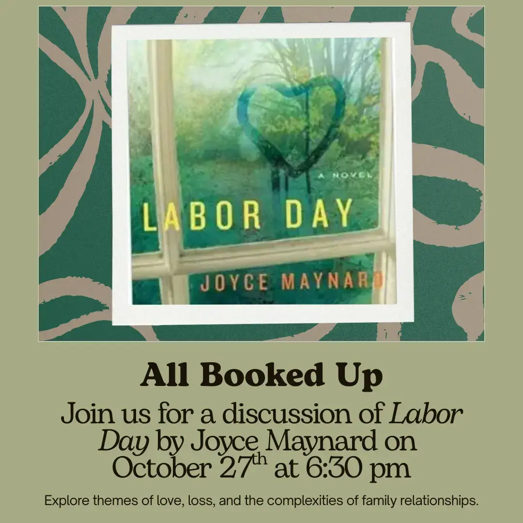 Explore themes of love, loss, and the complexities of family relationships with All Booked Up as we discuss Labor Day by Joyce Maynard on October 27th at 6:30 pm.