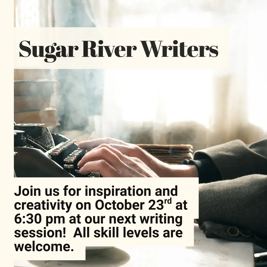 Join the Sugar River Writers for inspiration and creativity on October 23rd at 6:30 pm at our next writing session! All skill levels are welcome.