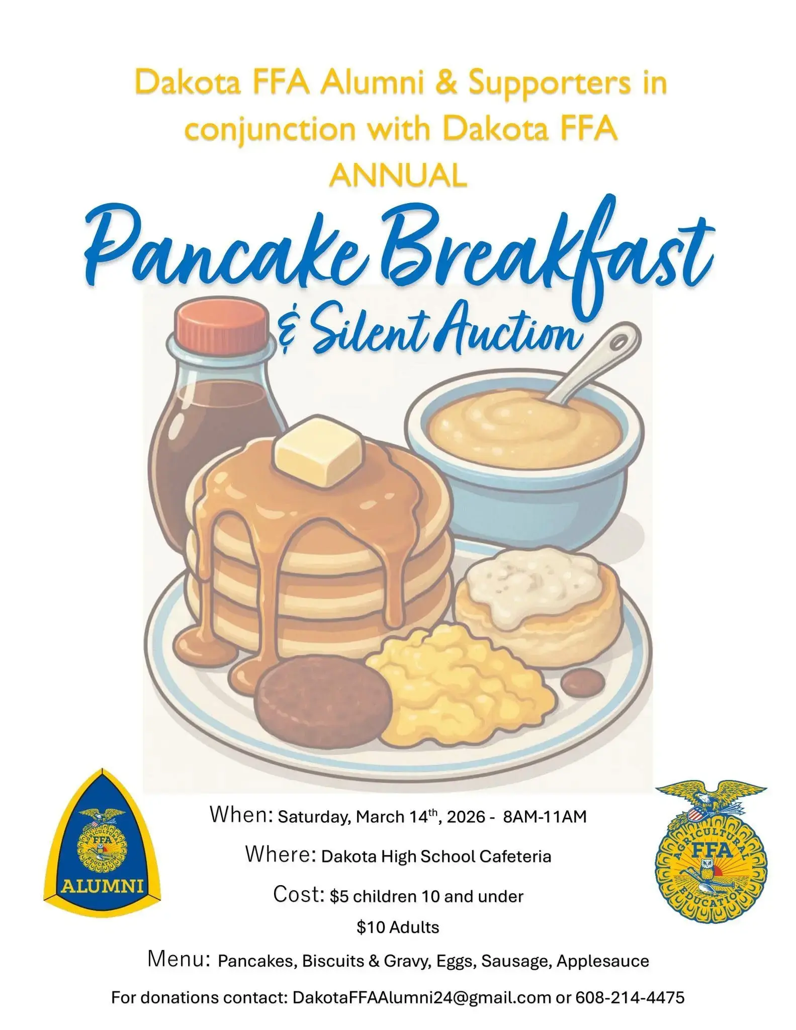 Saturday March 21, 2026 4:00-7:00 pm Pancake Supper - Bake Sale - Silent Auction Adults $9.00 Children 5-12 $4.50 under 5 free All you can eat pancakes!