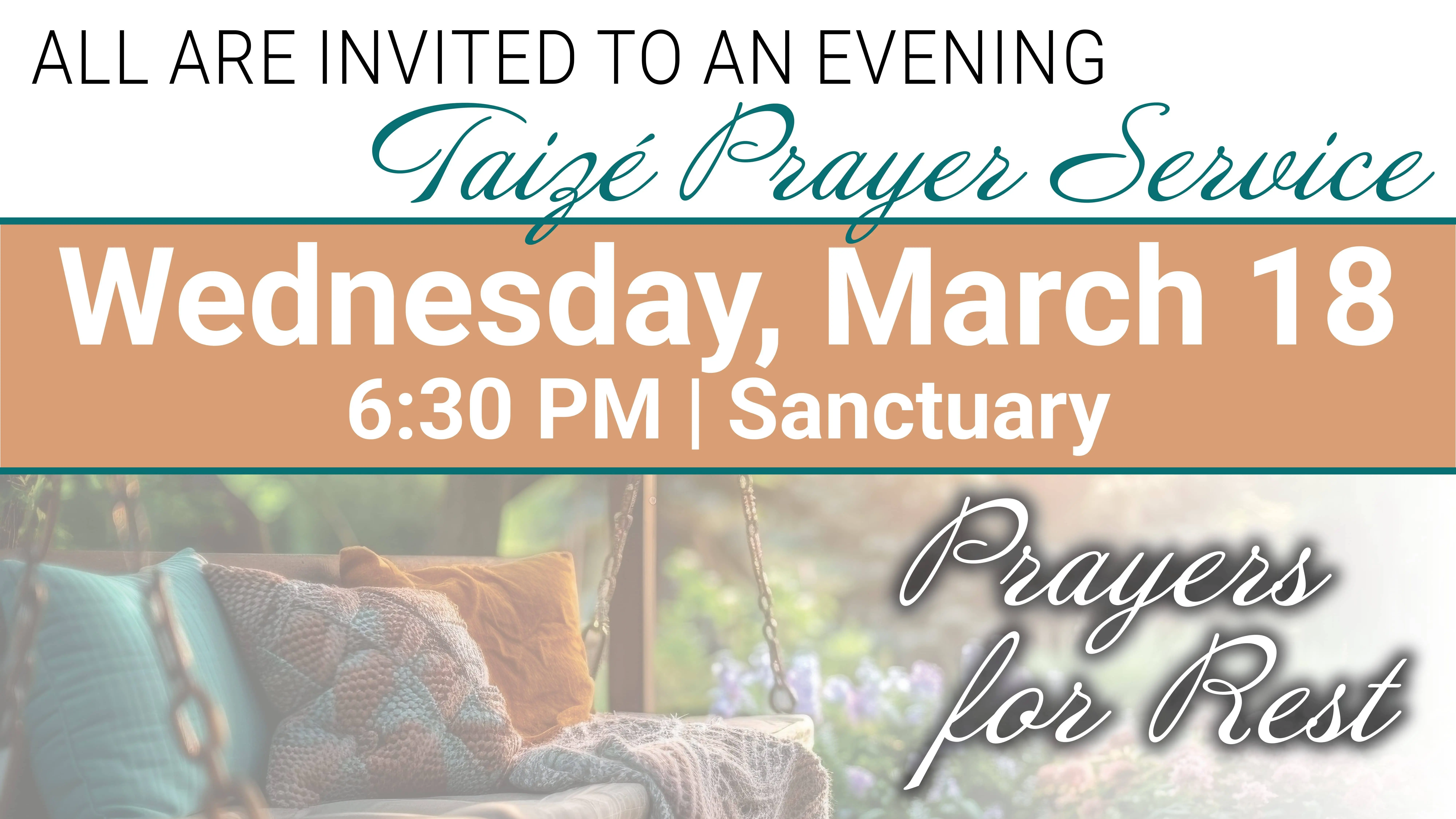 Taizé Prayer Service. This month, leading up to Holy Week, our focus will be Prayers of Rest. T Curious about what a Taizé Service is all about? Taizé prayer service invites you to worship God through the