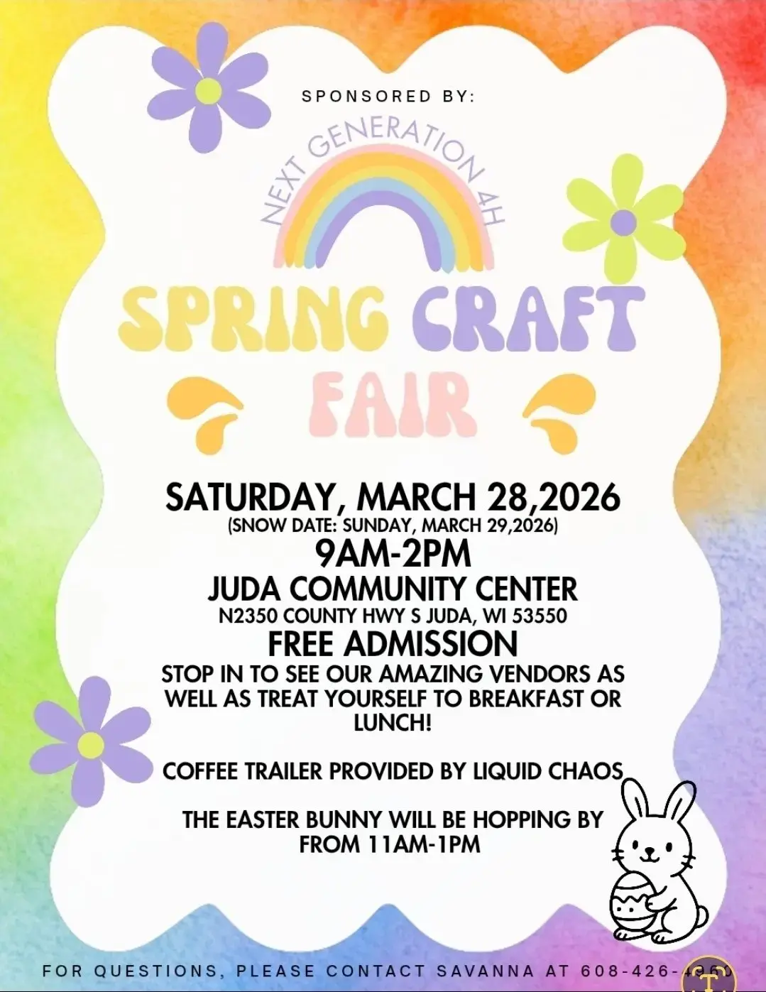 Spring Craft Fair Join us March 28th from 9 AM – 2 PM for our Spring Craft Fair! Weather date: March 29th. The Easter Bunny will be stopping by, and we’ll have a great lunch stand ready